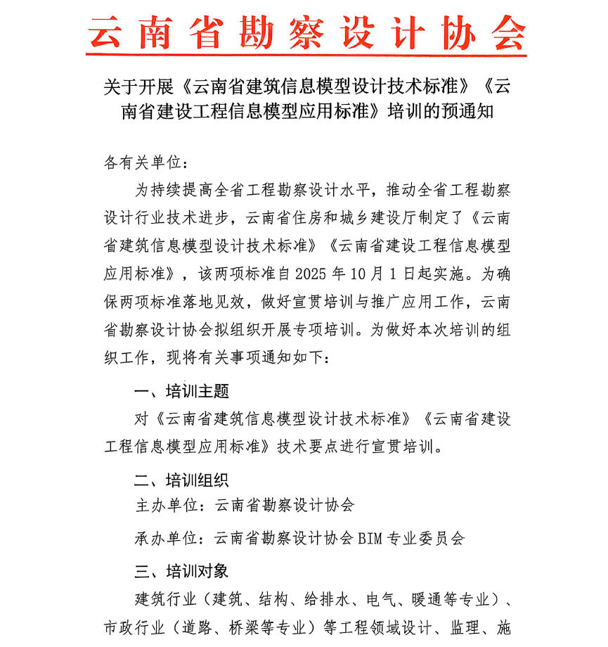 关于开展《云南省建筑信息模型设计技术标准》《云南省建设工程信息模型应用标准》培训的预通知