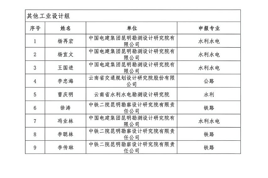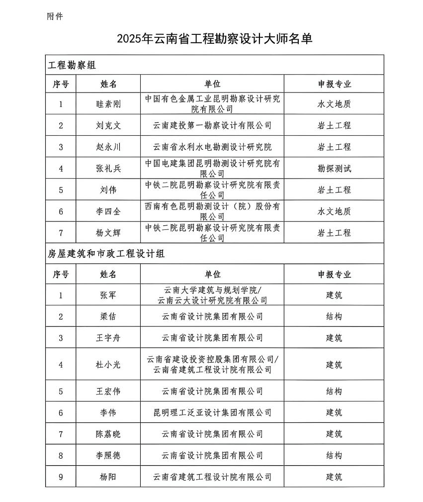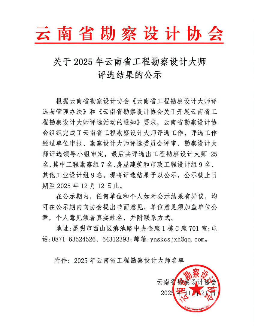关于2025年云南省工程勘察设计大师评选结果的公示