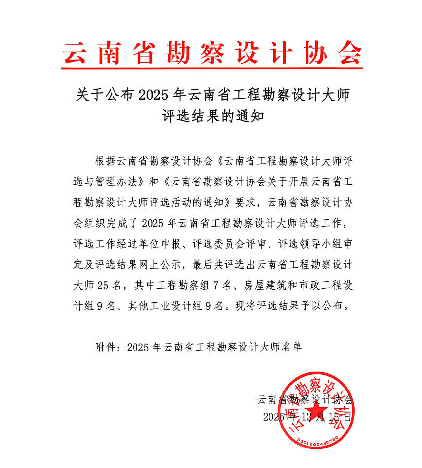 关于公布2025年云南省工程勘察设计大师评选结果的通知
